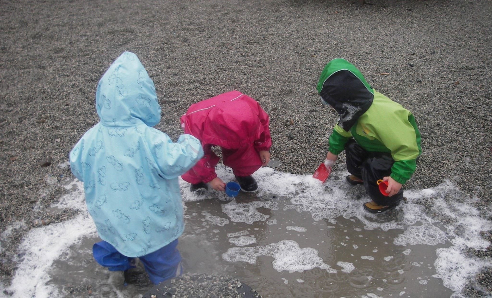 Dråpene som faller ned fra paraplyen symboliserer noen av de konkrete aktivitetene/erfaringene vi vil gi barna i hverdagen for å nå disse målene. Dråpene faller ned i dammen og skaper en stor og deilig «opplevelsesdam» for barna til å hoppe og plaske i.