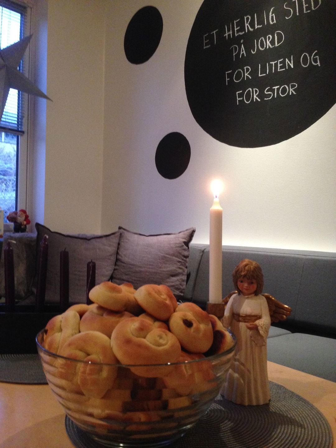 I dag fikk avdelingene besøk av Luciatoget under frokosten. Det var nesten magisk å se hvordan rom for rom ble fylt av lys, varme og glede når Lucia og følget kom syngende hvitkledde og glitrende. I tradisjonens tro er det førskolebarna som både baker Lussekatter og går i Luciatog. Foreldrene til førskolebarna er også invitert til å spise frokost med oss. I dempet belysning nøt vi et felles måltid med frokost og selvbakte Lussekatter.