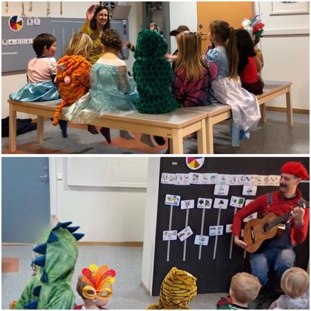 Veldig kjekt at dere hjemme har tatt utfordringen og hjulpet barna med planlegging og forberedelser av utkledningsklær.Flott at dere har tatt utfordringen om å tenke gjenbruk. Det var fornøyde, og stolte barn i barnehagen i dag. Ikke alle ville ha på antrekket fra start men det kom på etterhvert. Sang, musikk, dans og karnevalsleker gjorde dagen perfekt. Her vil vi dele med dere, små glimt fra en innholdsrik, lekende og veldig gøy dag.