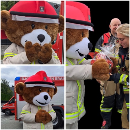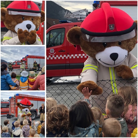 I år som i fjor og året før der har vi fått besøk av Bjørnafjorden brann og redning. Vi er så takknemlig for at de prioriterer å besøke oss med brannbil, utstyr og mannskap. I år ble vi ekstra glad for at vi også fikk brannbamsen Bjørnis på besøk. Brannbamsen ble også glad når han fikk lørdagsgodteri i gave av oss.