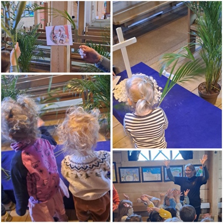 Palmesøndag – Barna får høre om da Jesus red inn i Jerusalem. De får vifte med palmegrener og rope "Hosianna!"