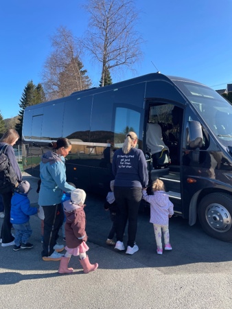 Bussturen til og fra kirken med Svein Kaptein er også et høydepunkt. Da kjører vi selvfølgelig med alle barna i hvert sitt barnesete, festet med trepunktssele.