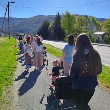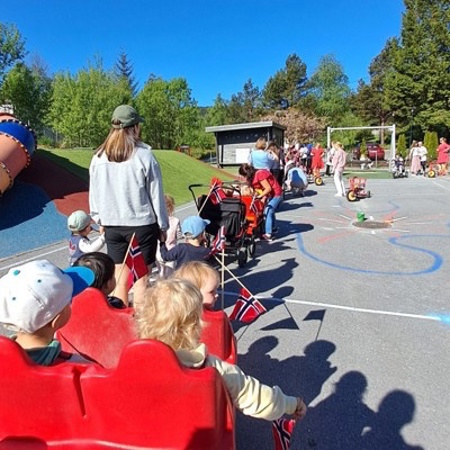 På nasjonaldagen 17. mai deltar alltid barnehagen i prosesjonen på Søfteland med egen fane. Kjekt at mange hadde anledning til å delta der og gjøre barnehagen synlig i nærmiljøet og markere dagen i fellesskap.