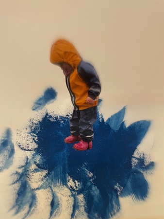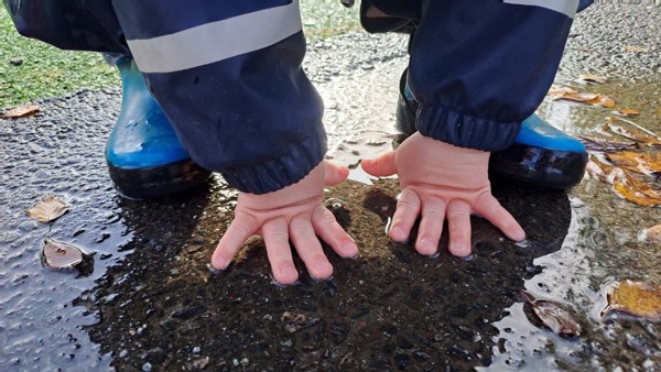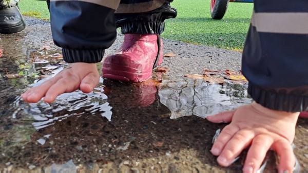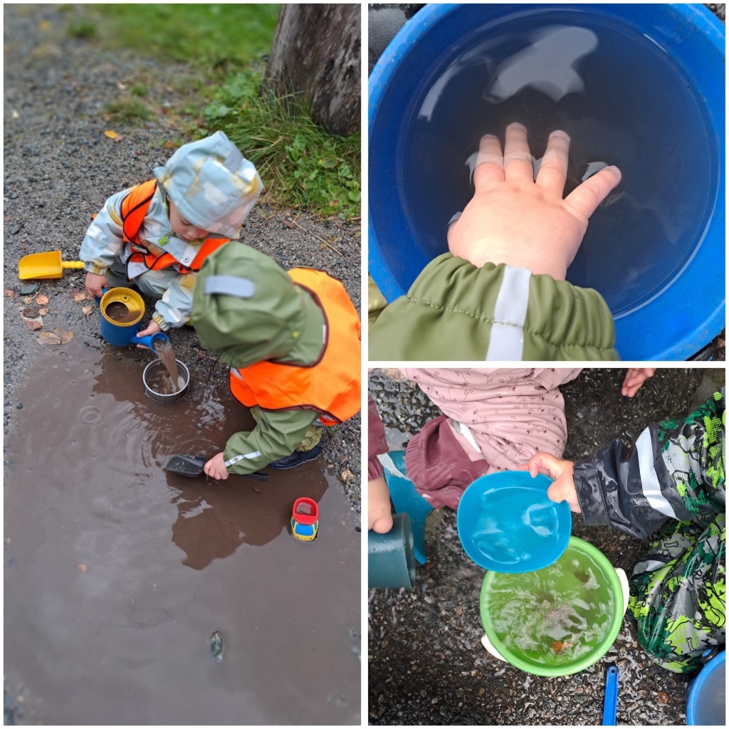 Vi utforsker vann – sølepytter som inviterer til plasking, regndråper som samler seg på blader, og små bekker som renner gjennom skogen. Vi kjenner også på at temperaturen i Vindalsvannet blir kaldere når vi har vanntilvenning hver mandag.