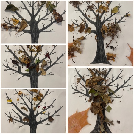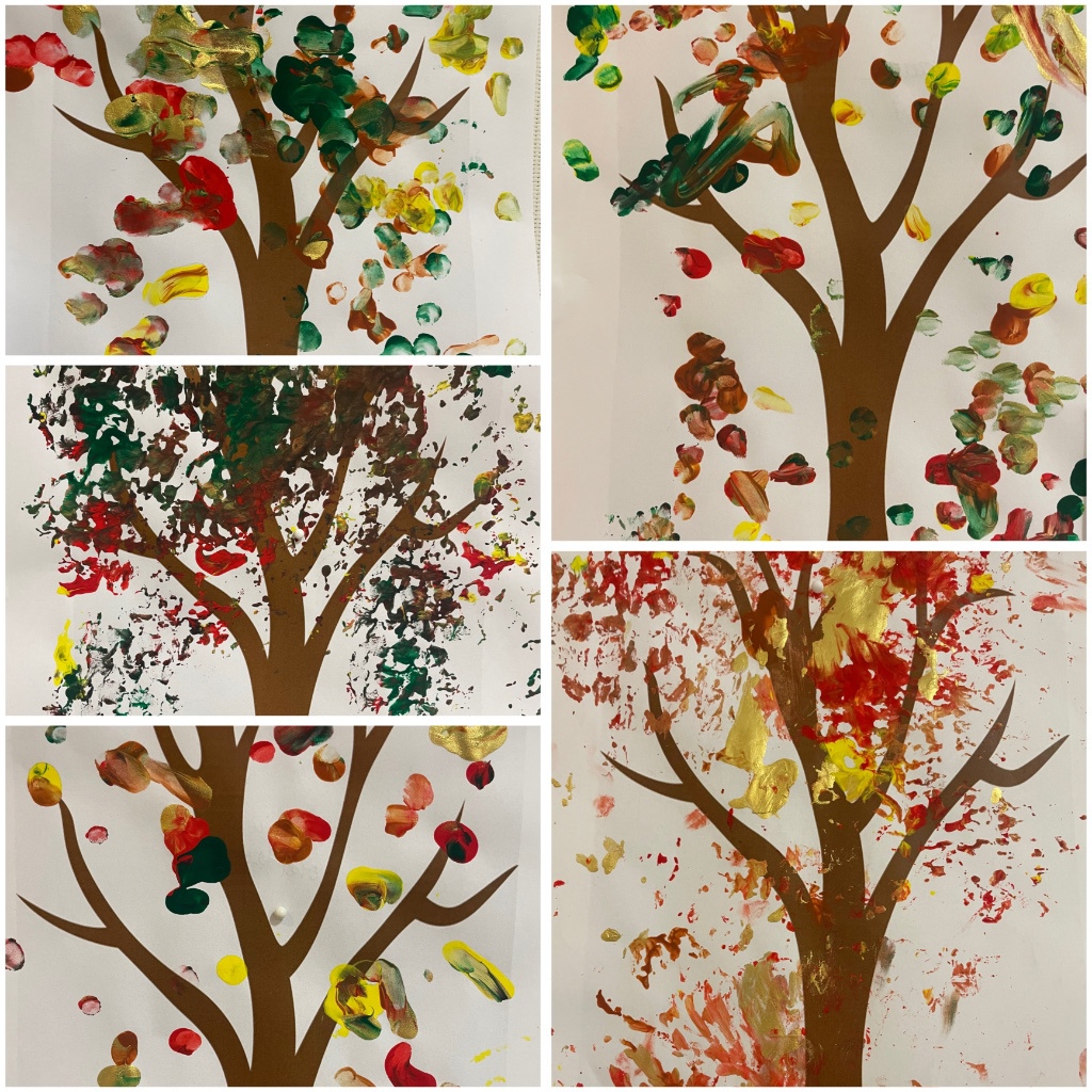 Røde, oransje og gule blader blir til kunstverk i barnehagens kreative prosjekter.